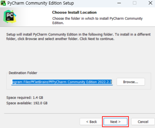 기본적으로 C:\Program Files\JetBrains\Pycharm Community Edition [버전] 폴더로 지정됩니다.