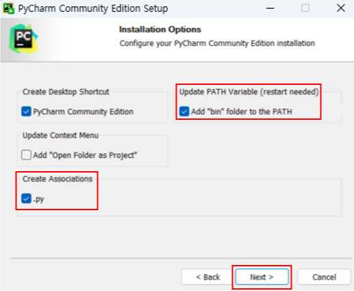 - Update PATH variable (restart required) : 반드시 체크하고 넘어가는 것이 좋습니다. 자동으로 환경 변수를 설정합니다. 재부팅 시 적용됩니다.