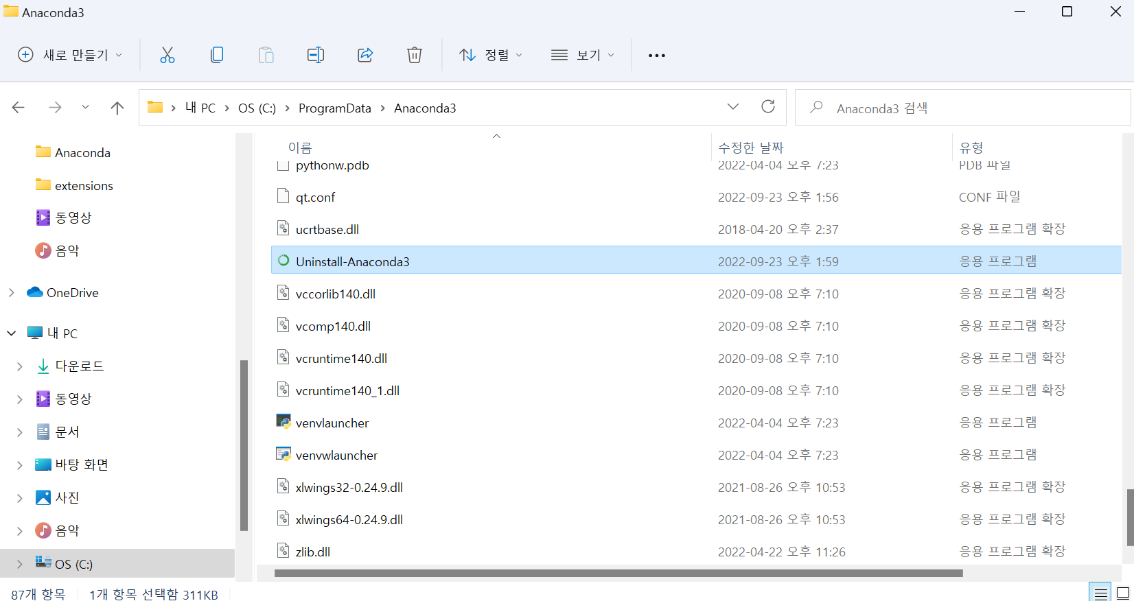 Anaconda 관련 모든 프로그램이 삭제된 것을 확인할 수 있습니다.